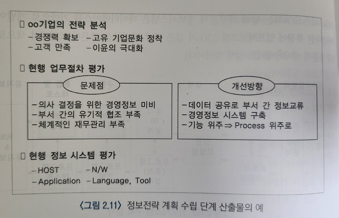 - 정보시스템 구축의 선행 단계로서 정보시스템을 구축하고자 하는 기업의 경영전략 및 장단점 분석하고 현행 업무 절차를 평가하여 개선사항 도출하여, 새로운 전략 및 업무 절차에 기초하여 정보 시스템 구축 계획을 수립하는 단계