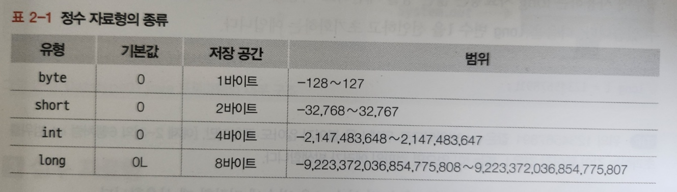 - 정수형의 유형에 따라 차지하는 저장 공간과 나타낼 수 있는 정수의 범위는 표와 같음