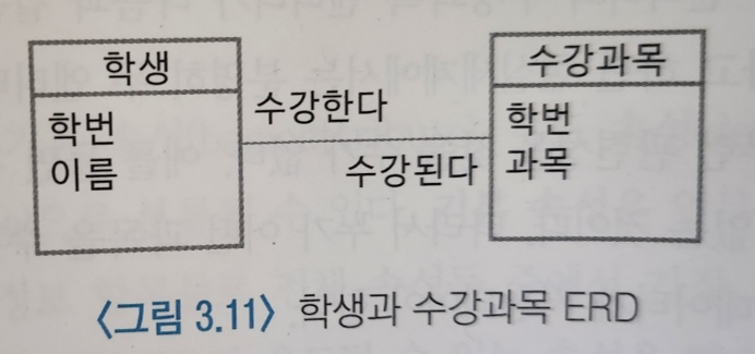 - ERD에서는 두 엔티티가 관계있다는 사실을 나타내기 위해 두 엔티티를 선으로 연결하고 학생 입장에서 수강과목이 어떤 관계에 잇는지, 과목 입장에서 학생이 어떤 관계에 있는지를 연결선 위, 아래에 표현해준다