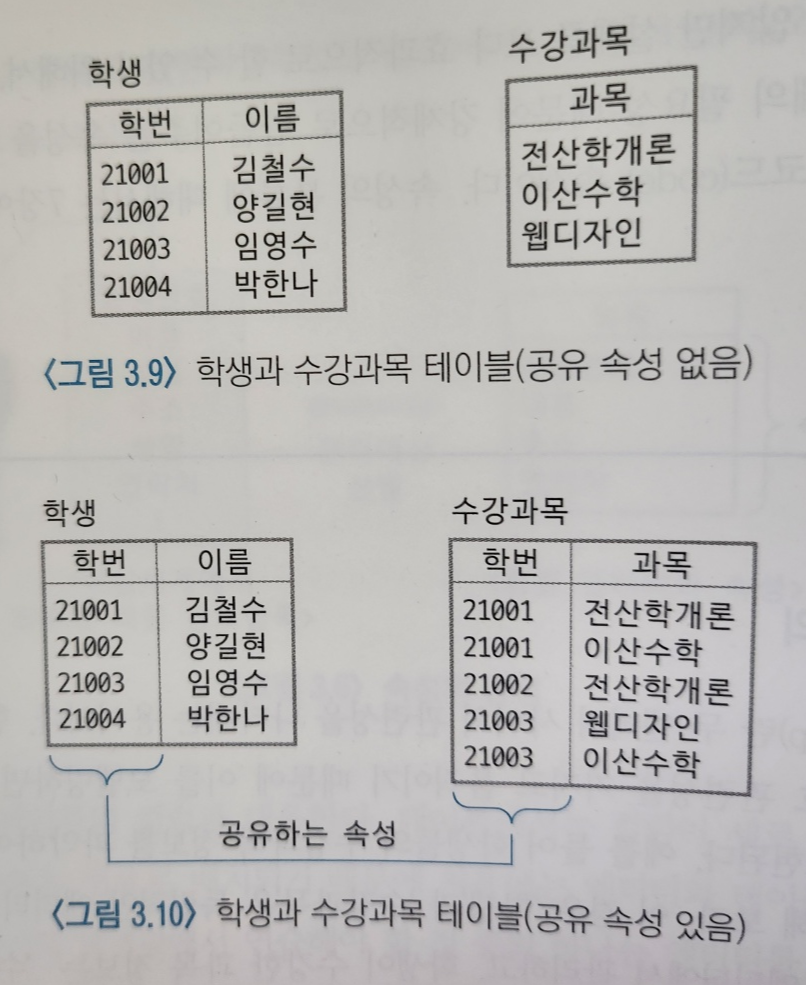 - 데이터가 저장되어 있다면 우리는 어떤 학생이 어떤 과목을 수강하는지 쉽게 알 수 있으며, 이것이 가능한 이유는 두 테이블이 학번이라는 공유 속성을 가지고 있다