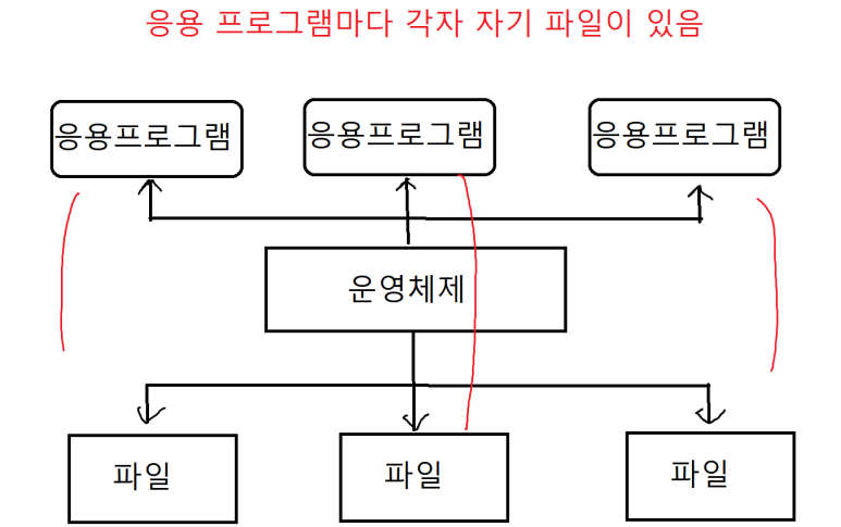 - 개별 응용 프로그램이 직접 파일에 접근하여 기록, 갱신, 삭제 할 수 있으며 데이터의 올바른 관리 여부는 전적으로 프로그램에 달려있음