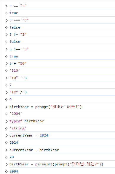 - ===, !== : λ κ°μ μλ£νκΉμ§ μλ²½νκ² κ°μμ§, κ°μ§ μμμ§ νμΈ