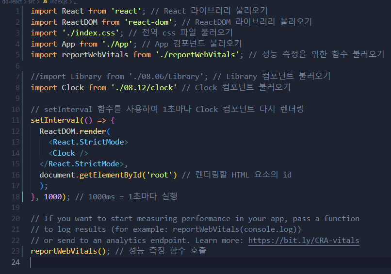 - 1초마다 렌더링을 하며 시간을 알려주는 시계를 만들어 보았습니다