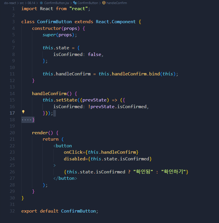 - ConfirmButton 컴포넌트는 확인 여부를 저장하기 위해 state의 isComfirmed라는 변수를 가지고 있고 초기값은 false임