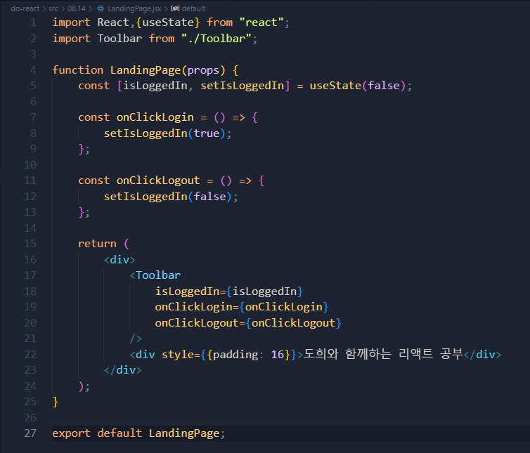- Toolbar 컴포넌트는 사용자의 로그인 여부를 나타내는 isLoggedin이라는 값을 props로 받아서 조건부 렌더링을 사용하여 환영 메시지를 표시하거나 감추고 로그인 로그아웃 버튼을 보여주는 역할을 함