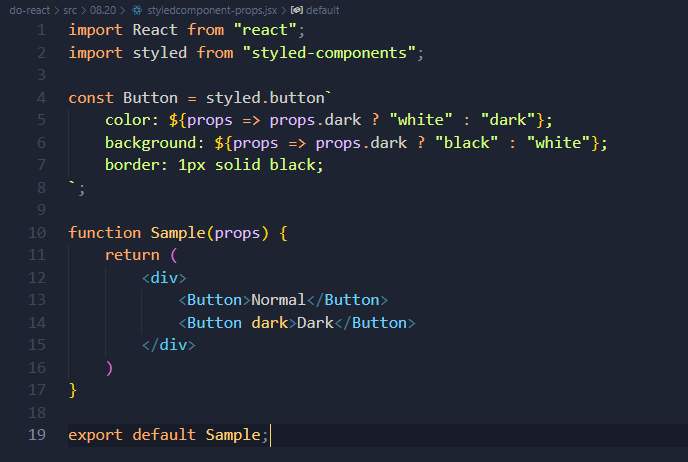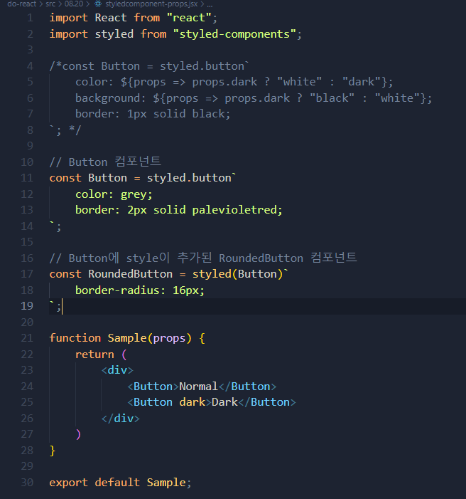 - ์ค์ ๋ฒํผ ์ปดํฌ๋ํธ์ ๋ค์ด๊ฐ props๋ ๊ทธ๋๋ก styled ์ปดํฌ๋ํธ๋ก ์ ๋ฌ