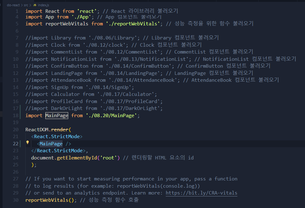 - ๋ฆฌ์กํธ styled-components์ MainPage.jsx ํ์ผ์ ์์ฑํ์ฌ ์ฝ๋๋ฅผ ์์ฑํ ํ ๊ผญ index.js ํ์ผ์์ Mainpage๋ฅผ import ํด์ฃผ์ด์ผ npm ์คํ ๋ช ๋ น์ด์ธ npm start ์์ฑ์ ์คํ ๊ฐ๋ฅ