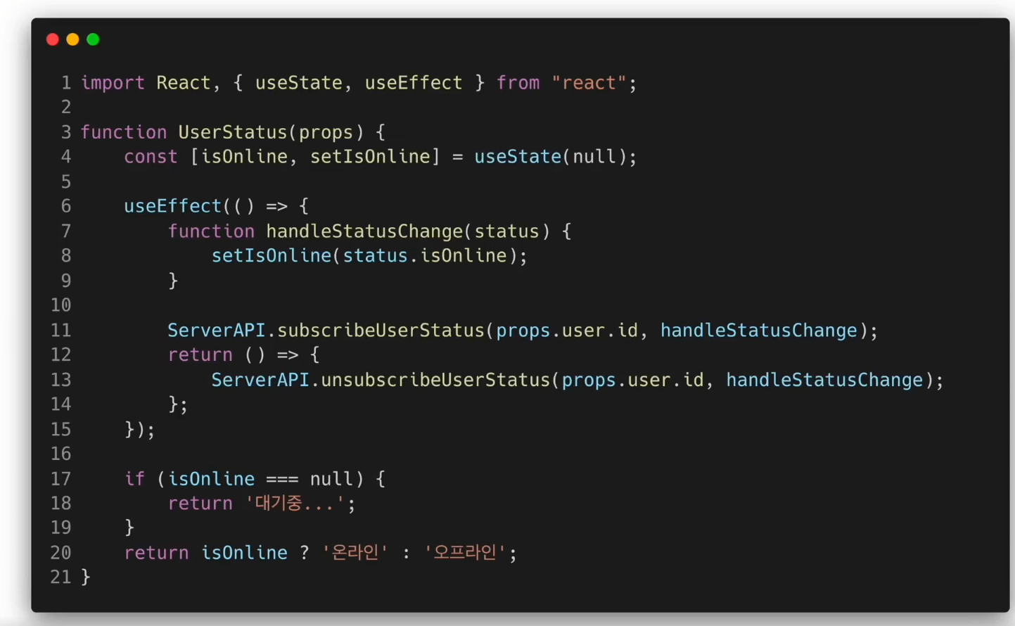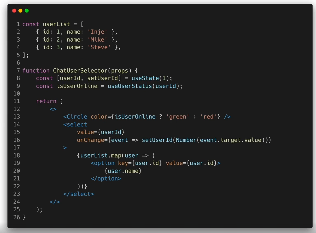 - userStatus๋ผ๋ ์ปดํฌ๋ํธ๋ isOnline์ด๋ผ๋ state์ ๋ฐ๋ผ์ ์ฌ์ฉ์์ ์ํ๊ฐ ์จ๋ผ์ธ์ธ์ง ์๋์ง๋ฅผ ํ ์คํธ๋ก ๋ณด์ฌ์ฃผ๋ ์ปดํฌ๋ํธ