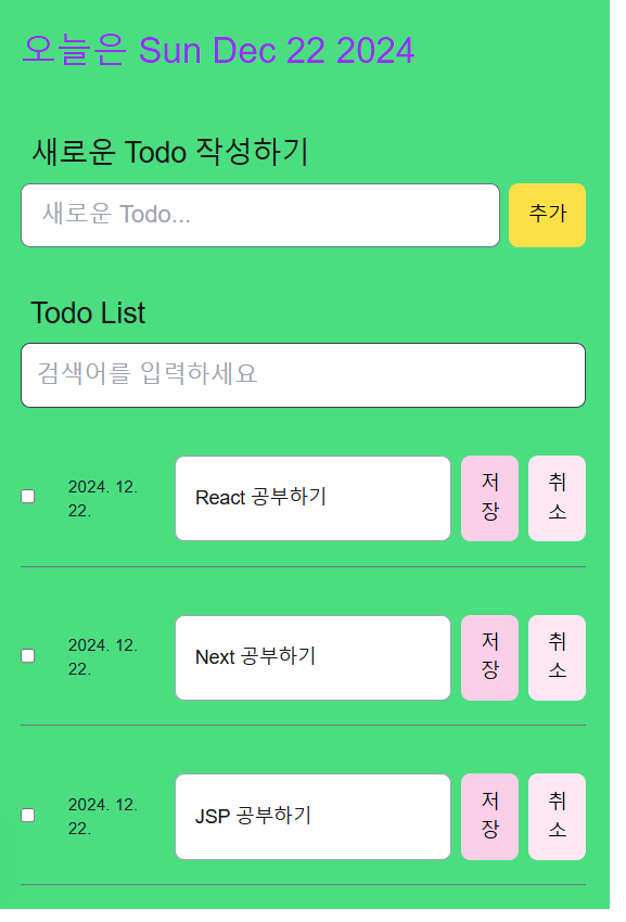 => 등록일자와 작성 내용, 수정 버튼, 삭제 버튼을 Todo List에 배치