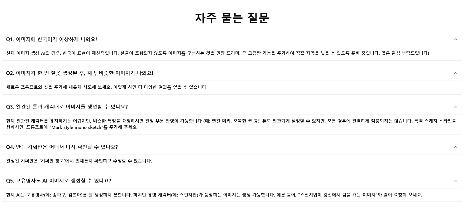 - 사용자가 궁금한 질문을 클릭하면 답변이 펼쳐지고, 다른 질문을 클릭하면 이전 답변은 접히도록 하여 깔끔한 정보 제공이 가능합니다
